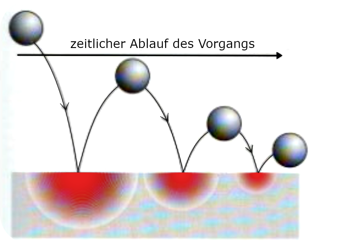 Stellen Sie sich einen kleinen Hüpfball oder Flummiball vor, den Sie aus einer gewissen Höhe auf den glatten Boden ihres Zimmers fallen lassen. Oder stellen Sie sich etwas ganz anderes vor, zum Beispiel, Sie bohren mit Ihrer Bohrmaschine ein Loch in die Wand. Stellen Sie sich die Vorgänge ganz so vor, wie sie in der Wirklichkeit ablaufen.