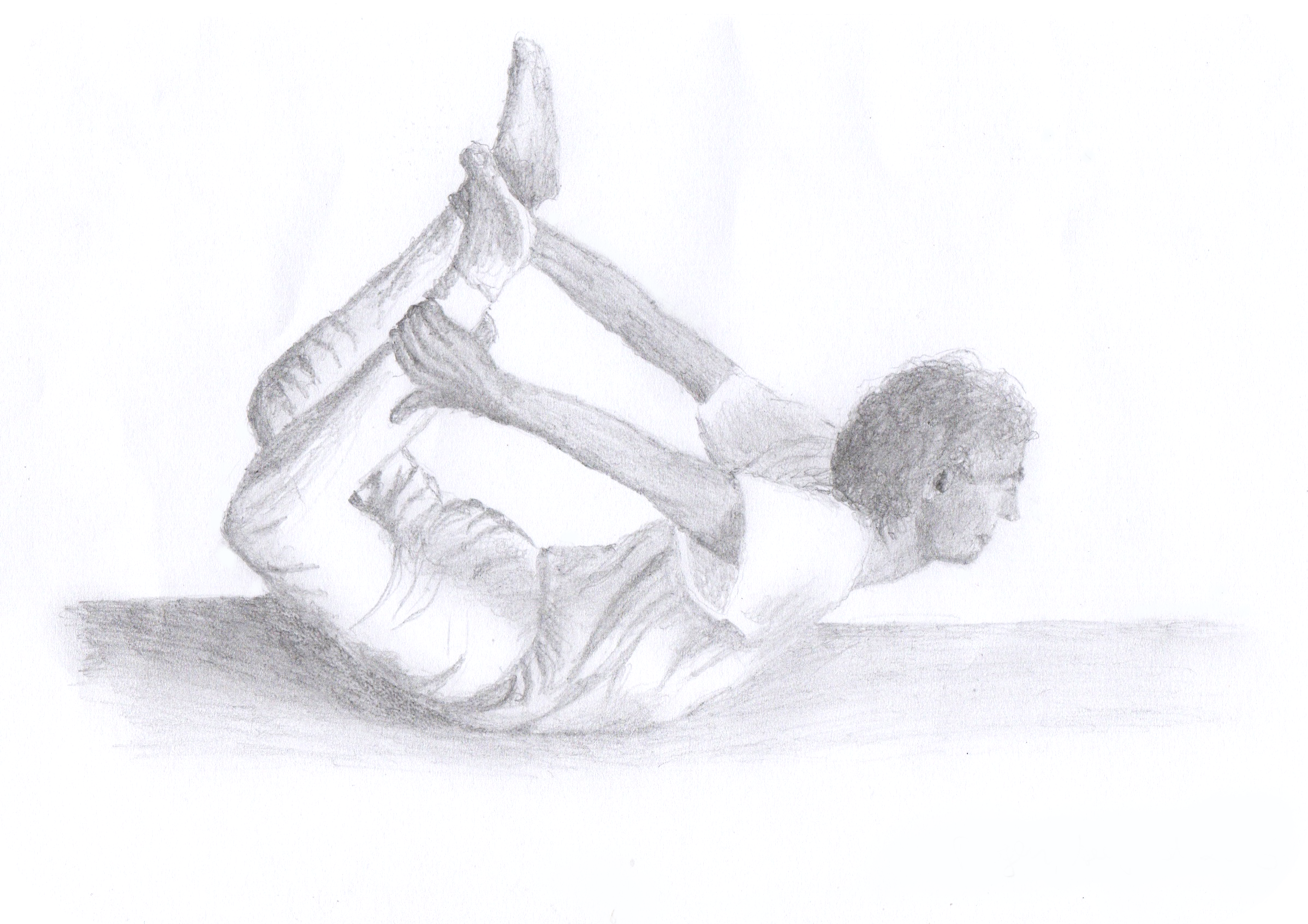 Die Asanastellung "Bogen". "Der Bogen ist ein Sinnbild für eine gesunde nervliche und körperliche Spannkraft und stellt die vitale Substanz der Konzentrationsfähigkeit dar, die der Übende aus dem Luftkreis seiner Umgebung aktiviert und in der Antwort einer Aktivität aus ihm selbst durch den Willen mobilisiert. Der Umkreis und das Zentrum im Inneren wirken zusammen. Im Bogen ist dieses Zentrum durch die Mitte der Anspannung gekennzeichnet5." (Zeichnung: Autor) |