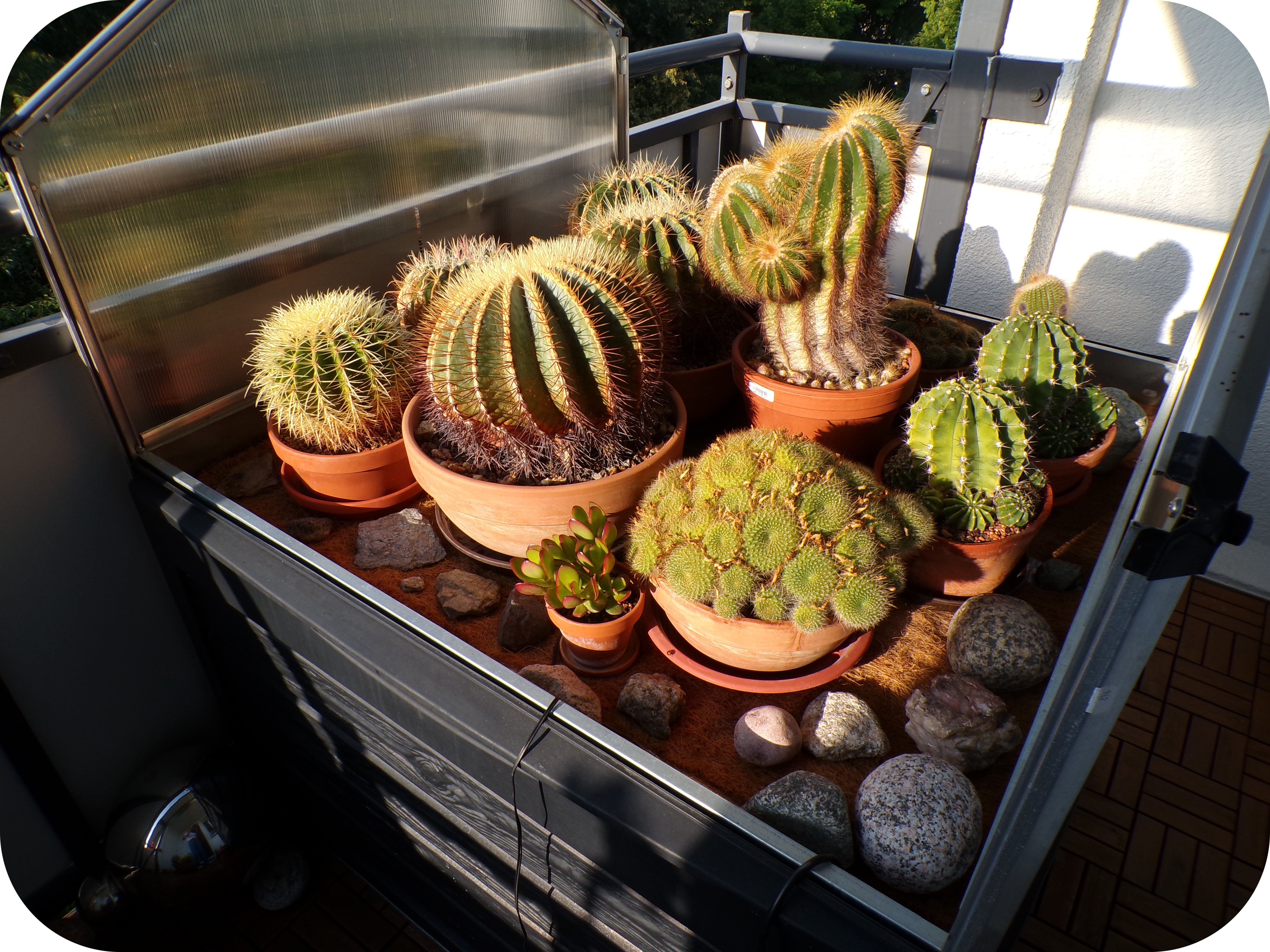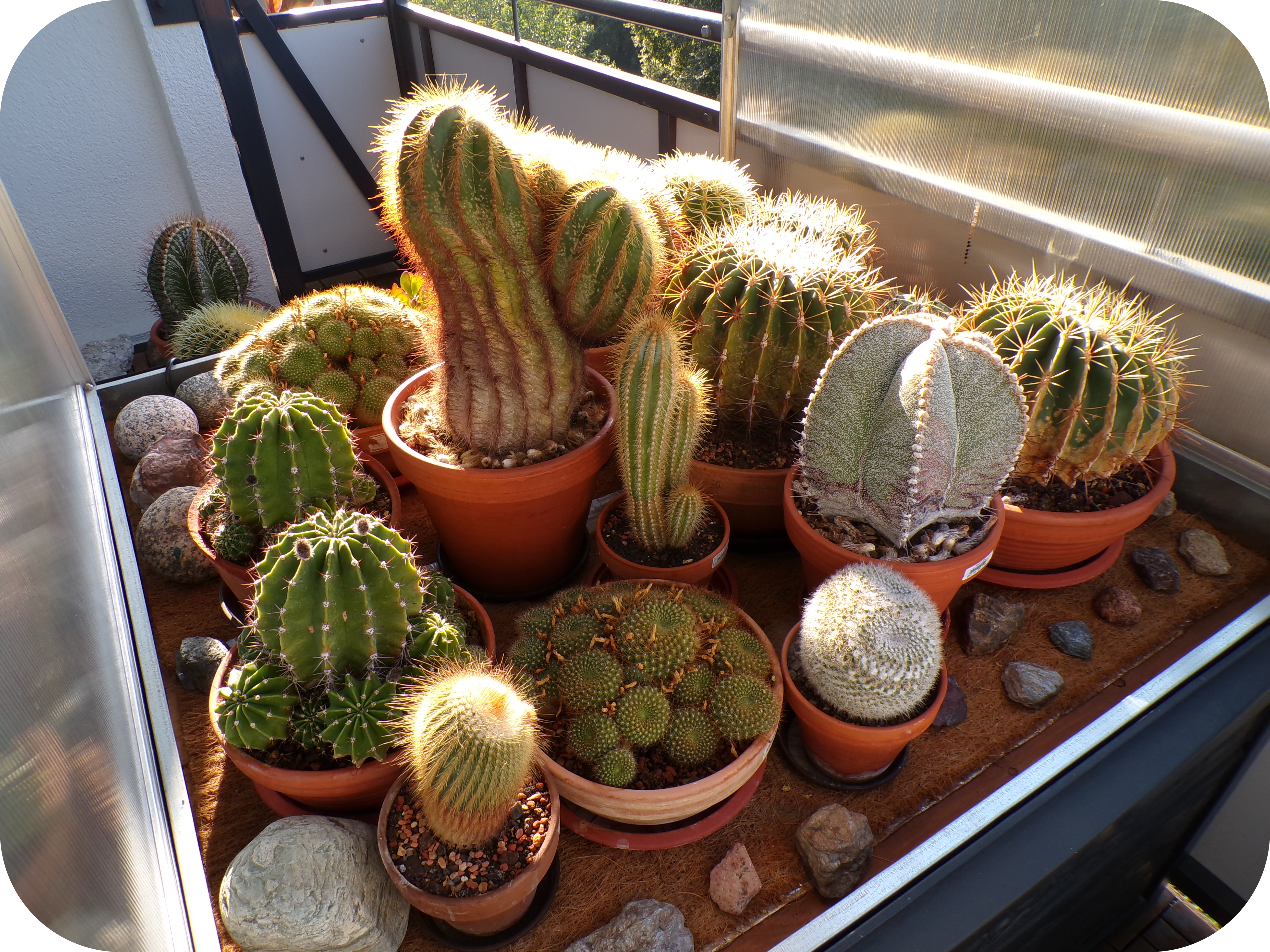 Eine Kakteensammlung. Geht man von dem in der Biologie üblichen Gedanken aus, dass es in erster Linie bei allen Lebewesen um das sogenannte Überleben geht, um die sogenannte "Erhaltung der Art" und sich alle Lebewesen immer wie in einer Art Konkurrenzkampf befinden, dann wird man sagen, diese Kakteen haben ihre Stacheln oder Dornen einfach dafür, um sogenannte Fraßfeinde abzuwehren. (Bild: Autor) |