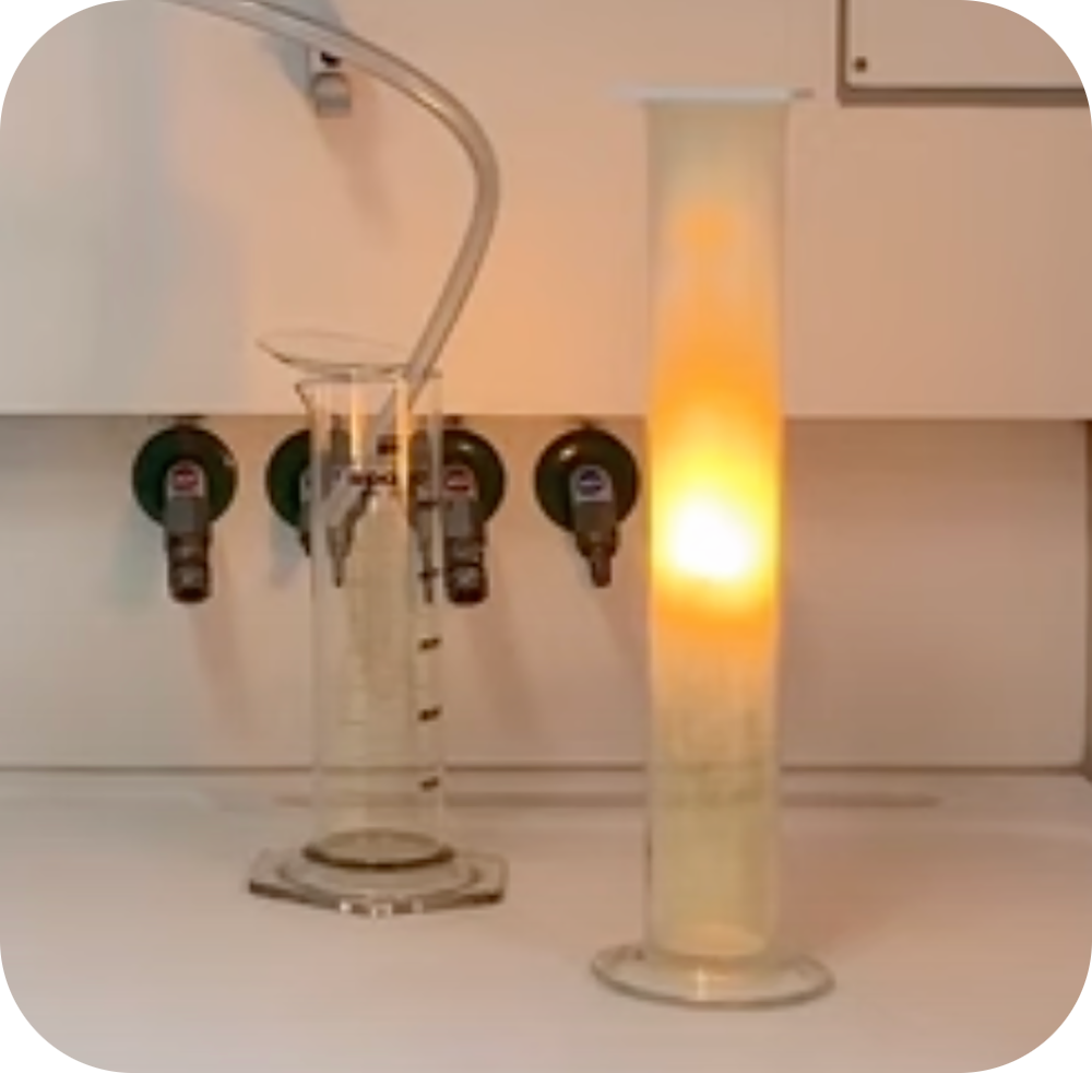 Eine chemische Reaktion mit heftiger Wärmeerscheinung (rechter Standzylinder). Ein in einen mit Chlorgas gefüllten Standzylinder eingebrachtes Stück metallisches Natrium entflammt und aus dem Chlorgas und dem Metall entsteht ein Salz: Kochsalz. (Bild: Autor) |