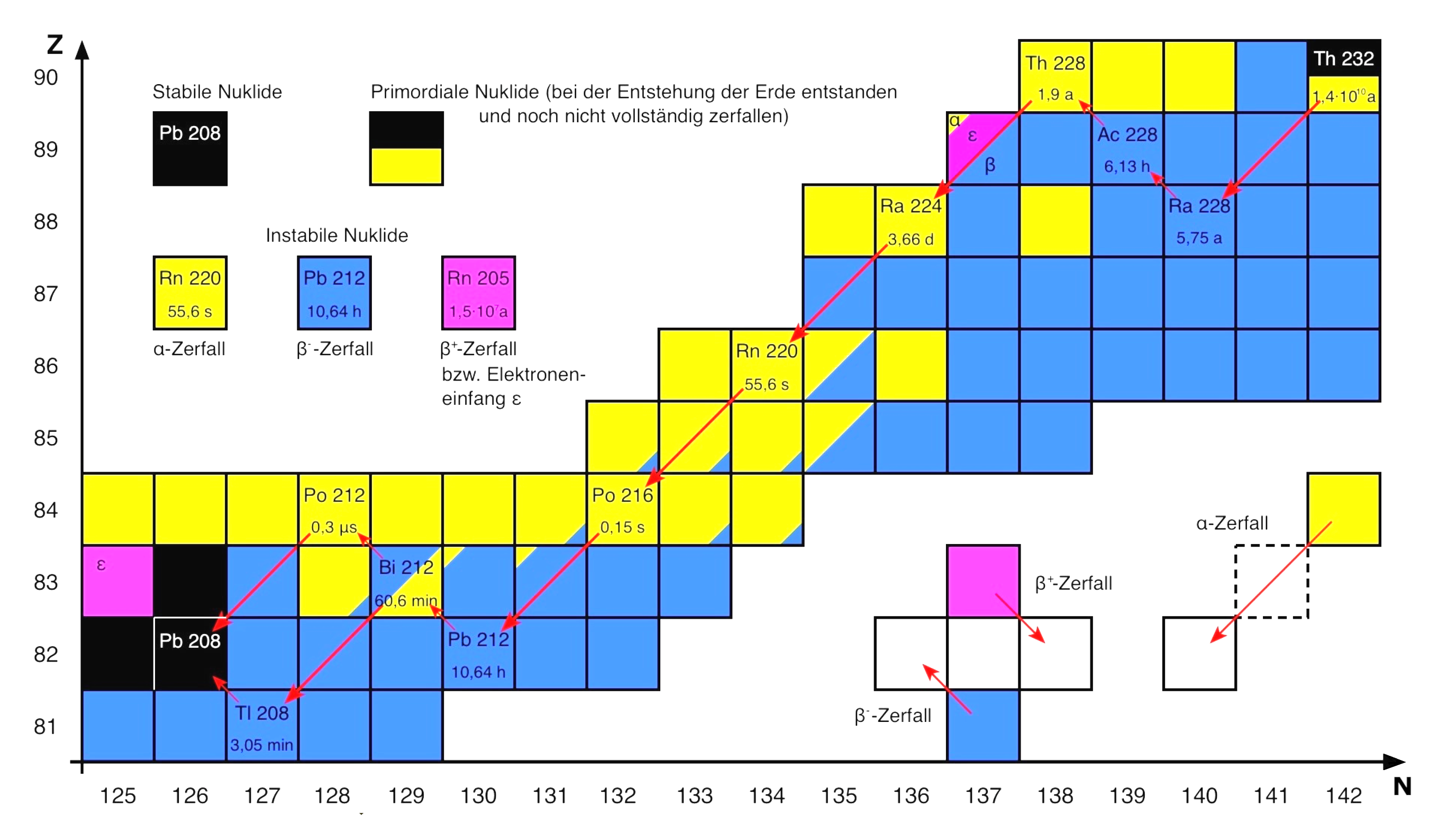 Das Schwermetall Thorium (Th) besteht in seinem natürlichen Vorkommen ausschließlich aus 232Th, einen primordialen Nuklid, also einer Form, die sich mit der Entstehung der Erde gebildet haben soll. Sein Zerfall über Zwischenschritte zu Blei 208Pb trägt zur Erdwärme bei. (Bild: Ausschnitt aus der "Karlsruher Nuklidkarte", 2018, überarbeitet) |