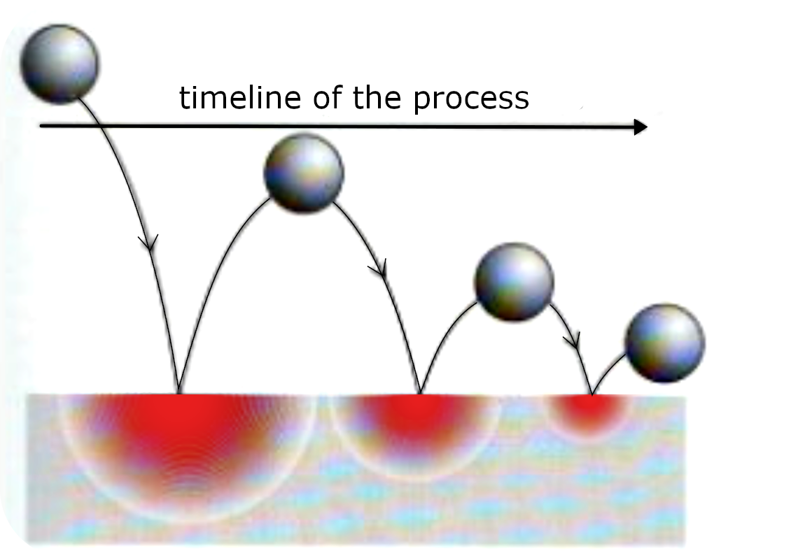 Bouncing rubber ball. The bouncing rubber ball also generates heat with every impact (strictly speaking, even when moving through the air, due to air resistance). This loss of energy through heat causes the ball to eventually come to rest. (Sketch: Author) |