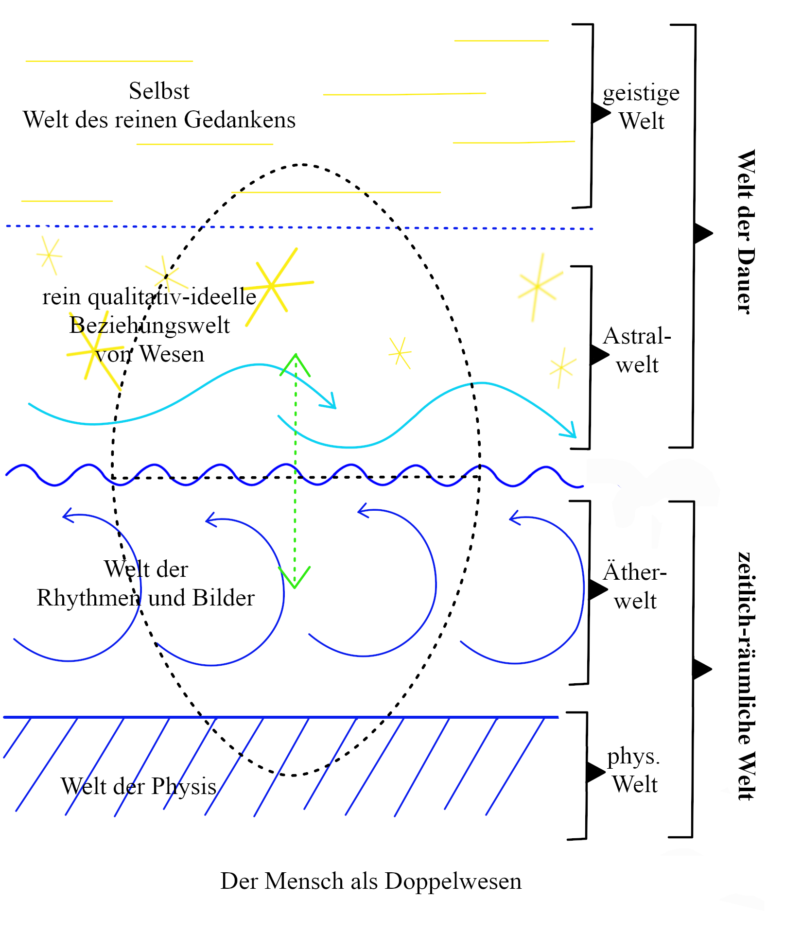 • Der Mensch ist seiner eigentlichen Gesamtheit nach ein Doppelwesen. Er gehört mit seiner äußeren, sinnlich sichtbaren Erscheinung sowohl der Welt des Vergänglichen als auch mit seinem geistigen Wesenskern der Welt der Dauer an (gestrichelte ellipsenförmige Figur).