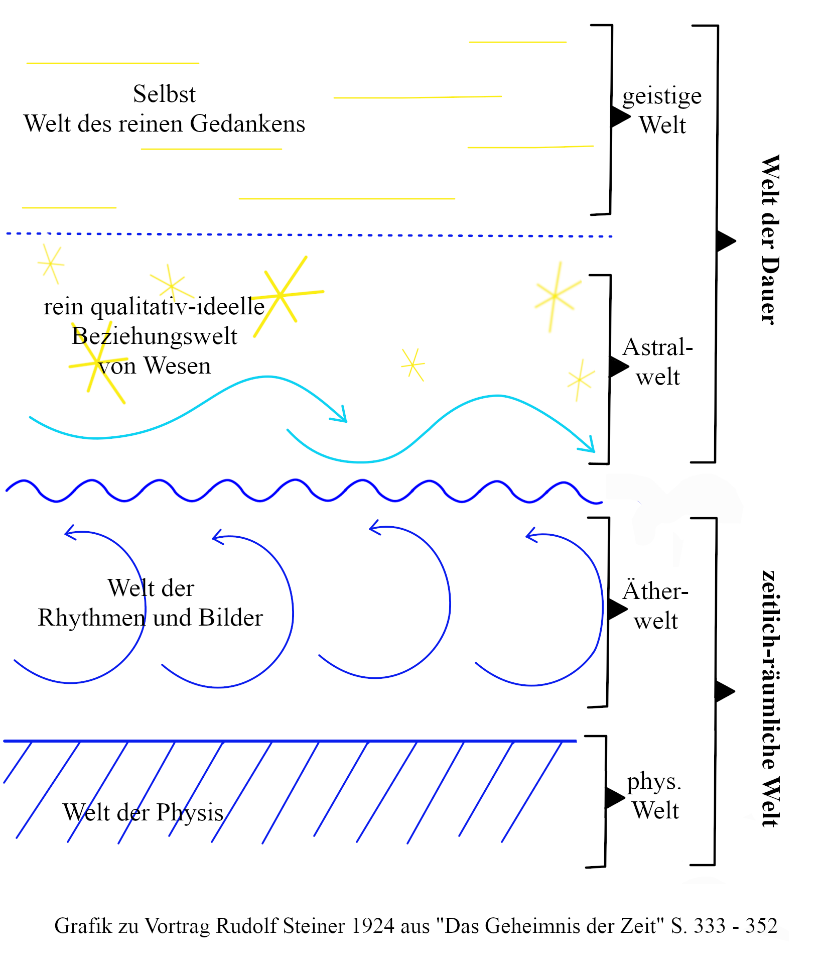 Nach seinem Versterben lebt der Mensch zunächst als leibfreies, geistig-seelisches Wesen, dann später als rein geistige Entität in der Welt der Dauer weiter. Er steht aber auch hier mit der leiblichen Sphäre in Zusammenhang, da in diesen Bereichen die Körperlichkeit für eine nächste Inkarnation schon vorbereitet wird.
