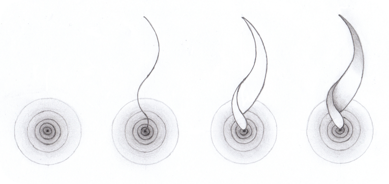 Von links nach rechts: "Aus einem weiten Umkreis legt sich in einer radialen Bewegung ein Zentrum an. Es ist eine Art Urbeginn, eine beginnende Zeit. Aus dieser Mitte entspringt eine Linie in einer rhythmischen Wellenbewegung. Mit rückläufigen Linien oder Bewegungen entfalten sich flächige Formen, welche sich schließlich in die dritte Dimension einer plastischen Räumlichkeit wölben." (Zeichnungen: Autor)