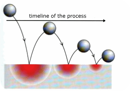 Bouncing rubber ball. The bouncing rubber ball also generates heat with every impact (strictly speaking, even when moving through the air, due to air resistance). This loss of energy through heat causes the ball to eventually come to rest. (Sketch: Author)