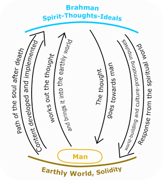 The human being in earthly life goes towards the thought, individualizes it in its implementation or design. However, the developed content remains so free that it re-enters the world as a universal good. In the person himself, a centre is established with a "new man" or with an "expanded humanity", which after death enters into the totality (Brahman: expression for the spiritual world in Indian philosophy). However, the "new man" already has a developmental effect on his environment in earthly existence, since the thought and the developed content also become available to his environment through his activity. In other words, from the spiritual point of view, man is not only a creature, but also a decisive participant in the further development of the world.