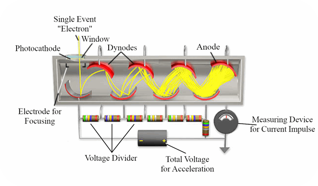 Sketch of a multiplier for registering individual events such as single electrons. The electron is multiplied step by step by acceleration, so that finally a measurable current pulse is generated. (Image: Author)