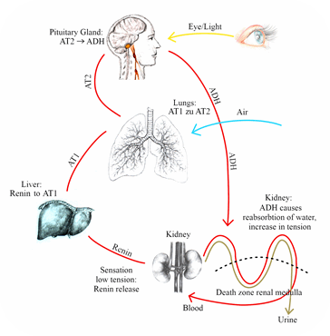 The sensation in the kidney organ of too low a tension in the blood (too low blood pressure) leads to the release of the hormone renin. Renin is converted into AT1 (angiotensin 1) in the liver. The lungs convert the AT1 into AT2 (angiotensin 2) under the influence of the respiratory process. Under the influence of the nerve-sensory area, or more precisely, through the exposure to light in the eye and the subsequent impulses in the nervous system/brain, AT2 stimulates the pituitary gland to release the hormone ADH (antidiuretic hormone). ADH, in turn, causes the kidneys to withdraw water from the blood. The result is an increase in the tension in the blood, i.e. the measurable blood pressure, but also an overall change in the composition of the blood.